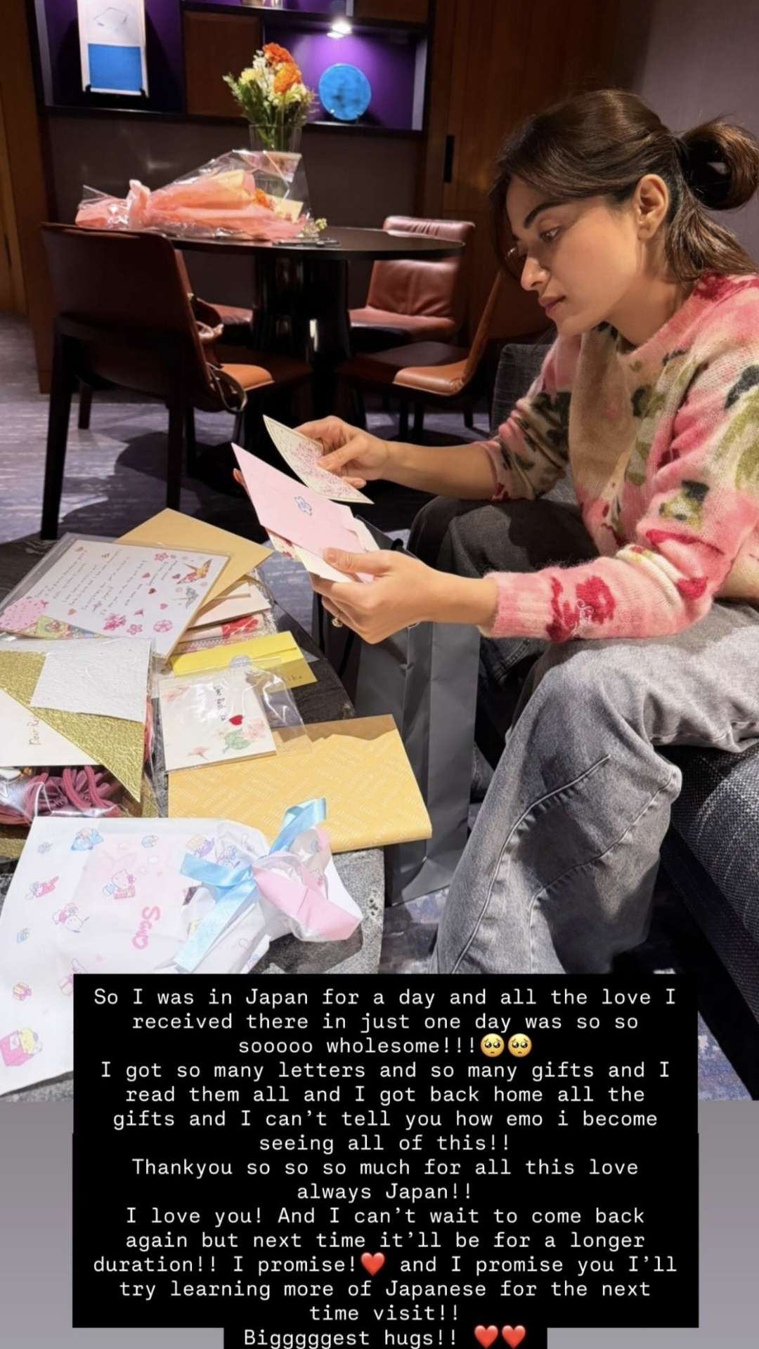 "So I was in Japan for a day and all the love I received there in just one day was so so sooooo wholesome!!! So many letters and so many gifts and I read them all and I got back home all the gifts and I can’t tell you how emotional I became seeing all of this," she wrote.