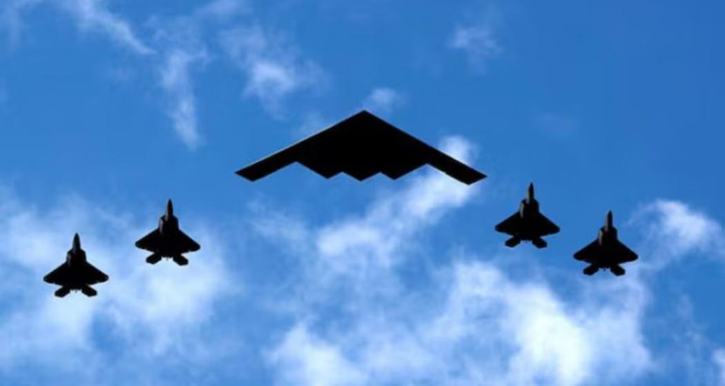 A US B-2 stealth bomber flies in synchronisation with F-22 Raptors during the strike mission targeting Iran’s nuclear sites at Fordow, Natanz and Isfahan.