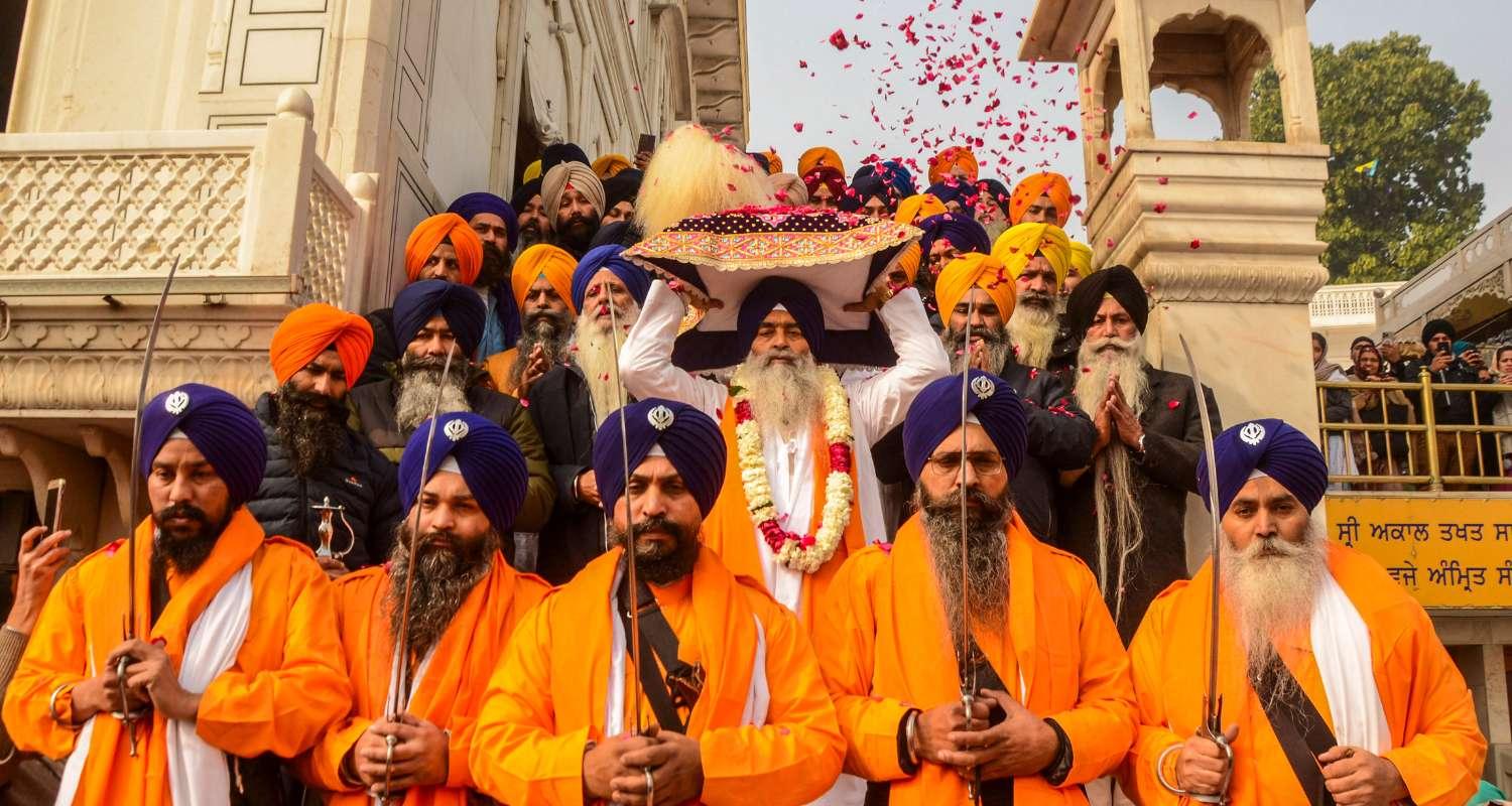 : The designated warriors ‘Panj Pyare’ and Sikh devotees during a 'Nagar Kirtan' procession organised on the eve of the birth anniversary of the 10th Sikh Guru, Guru Gobind Singh, at the Golden Temple in Amritsar. Guru Gobind Singh was born in the year 1666.