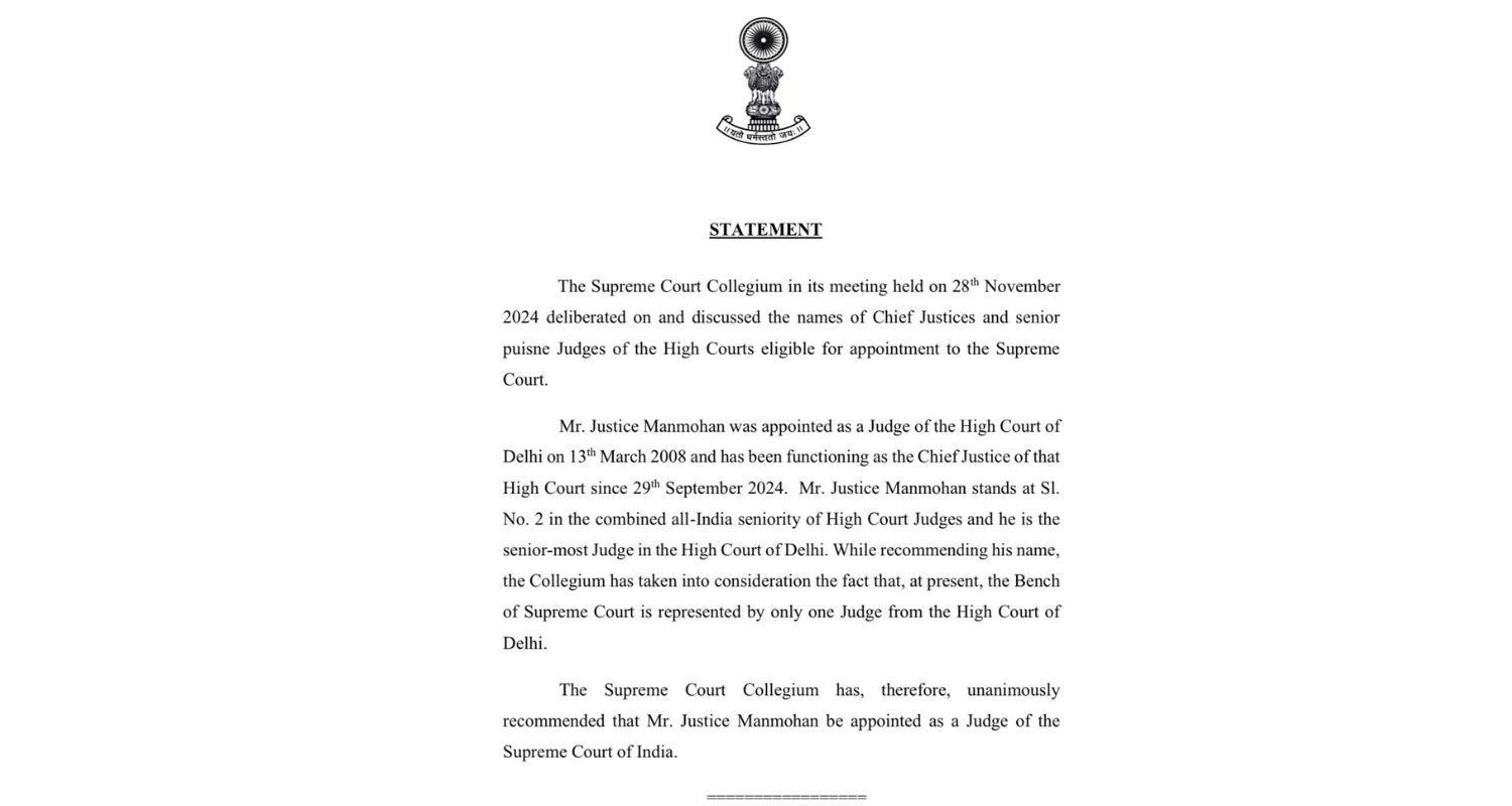 The Supreme Court Collegium has recommended the elevation of Justice Manmohan as a Judge of the Supreme Court of India. The recommendation was made on November 28, 2024, under the leadership of Chief Justice of India Sanjiv Khanna.