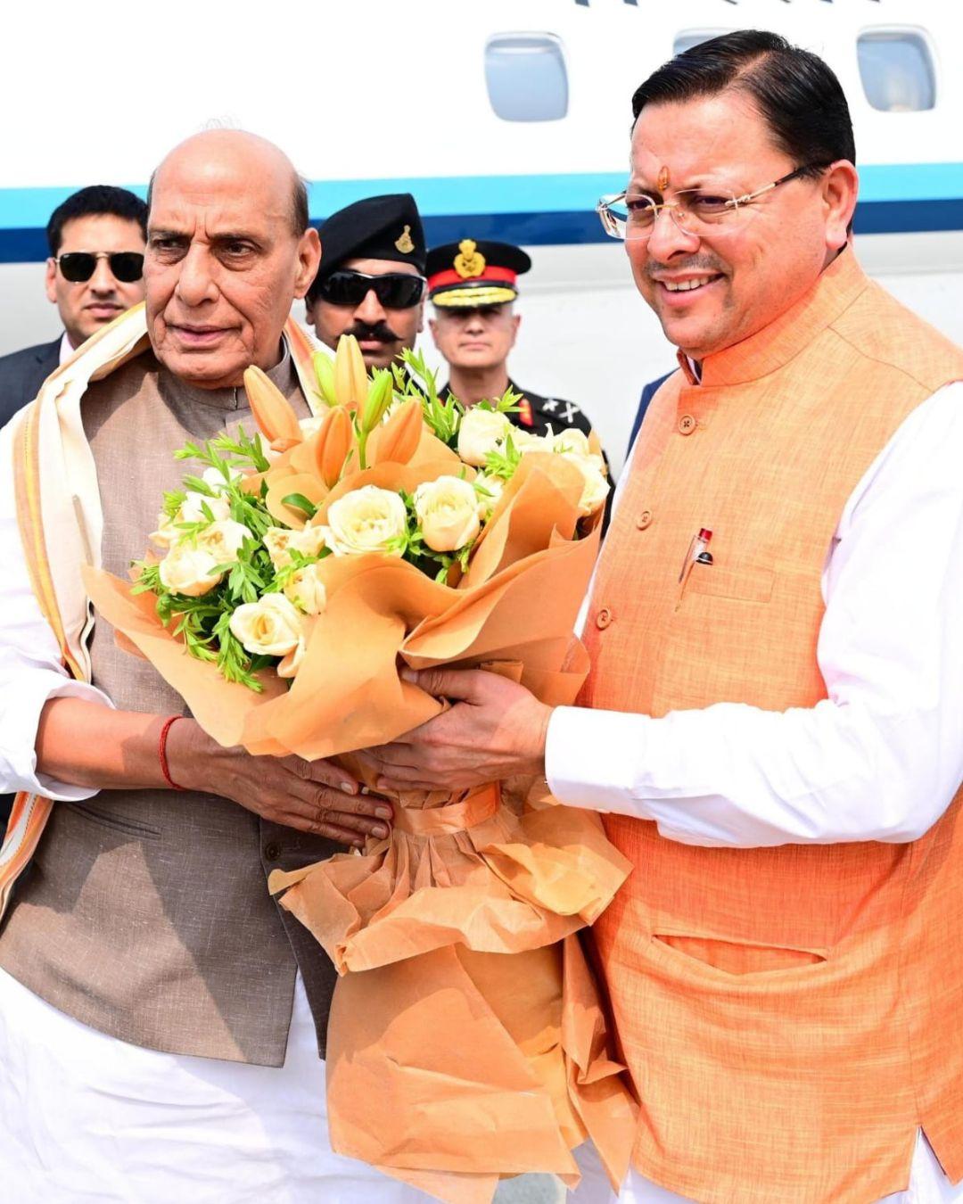 Uttarakhand Chief Minister Pushkar Singh Dhami greets Defence Minister Rajnath Singh in Dehradun on Monday.