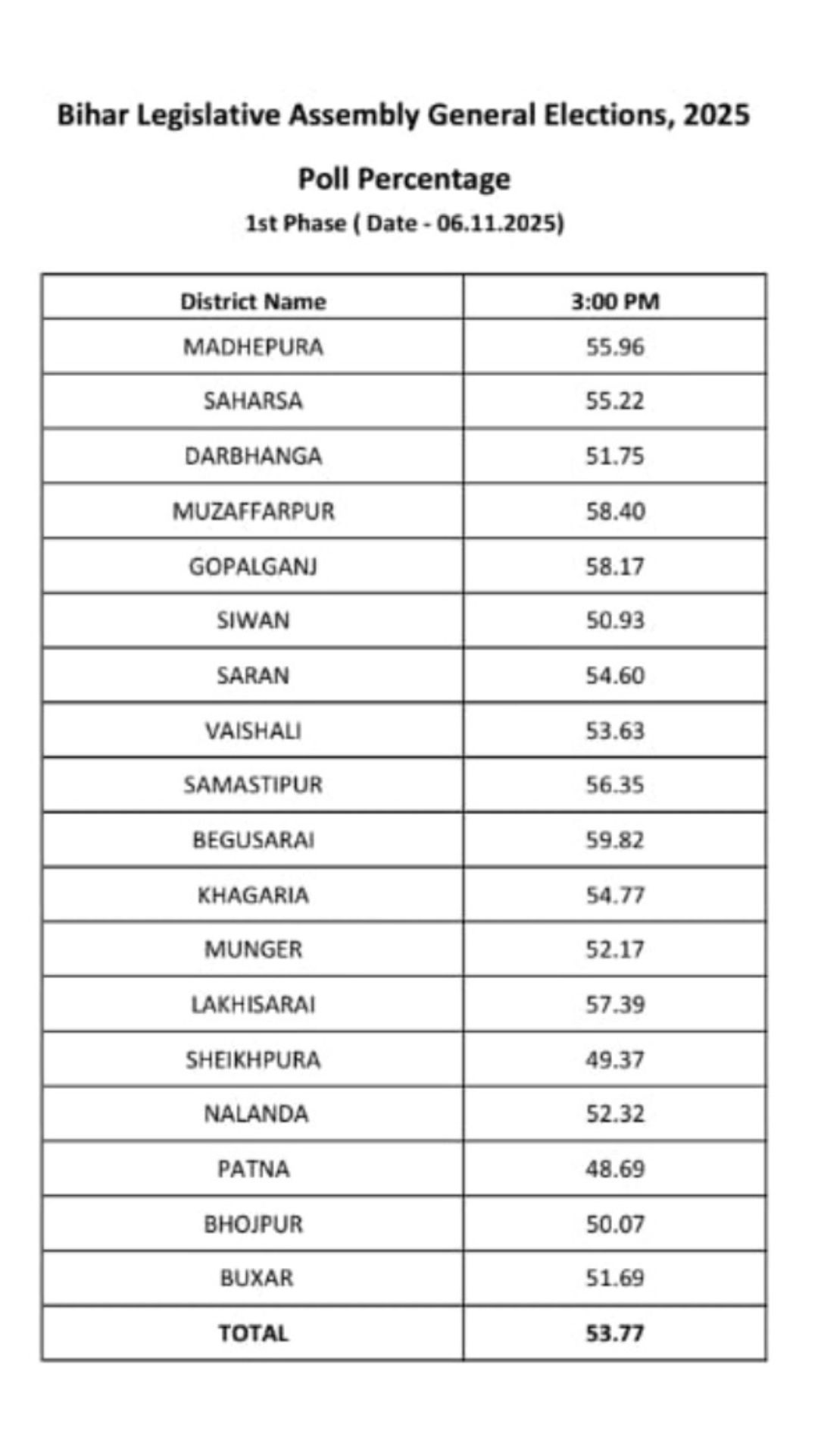 In the first phase of Bihar Assembly Elections, 42.31% voter turnout recorded till 1:00 pm. Among the 18 districts, Gopalganj recorded the highest turnout of 46.73%, followed by Lakhisarai with 46.37% and Begusarai with 46.02%, till 1:00 pm. Patna, the capital of Bihar, continue to record sluggish voter turnout among all districts with a turnout of 37.72%.