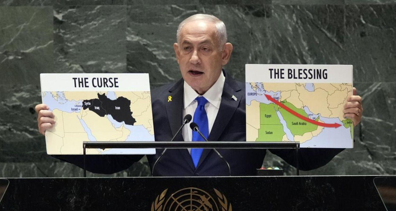 As he has often in the past, Netanyahu held up a map of the region, titled ‘THE CURSE’, marked up with a large marker.