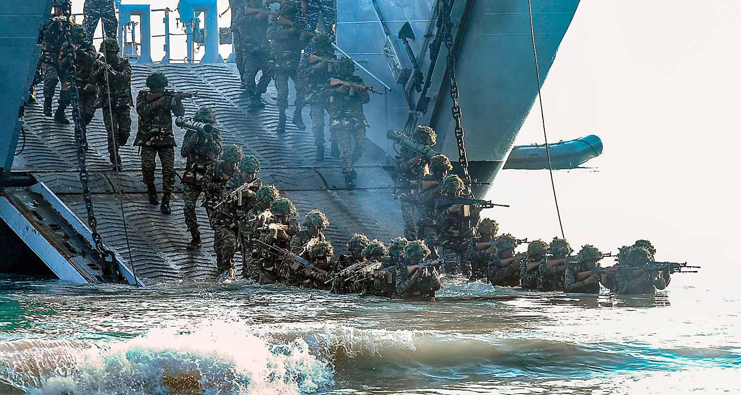 A glimpse of an operational demonstration by Andaman and Nicobar Command at Radhanagar beach, Swaraj Dweep Island, in Andaman and Nicobar Islands. Integral combat platforms and forces of the Andaman and Nicobar Command (ANC) demonstrated their multi-dimensional operational capabilities, including a coordinated landing by amphibious platforms of the Command.