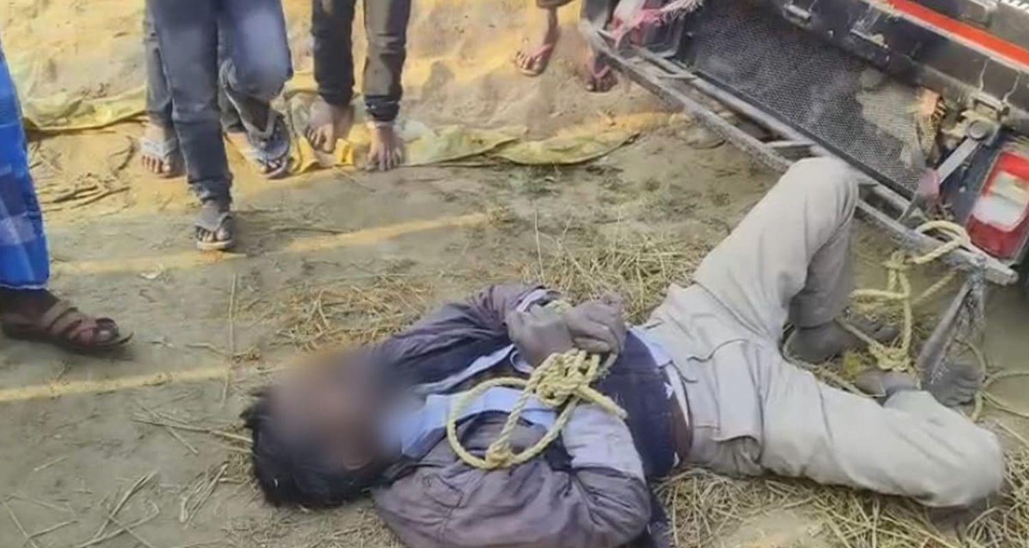 Disturbing pictures from the crime scene show Shambhu, dressed in beige trousers, a sky-blue shirt, and a grey jacket, lying motionless on the ground. His bare feet were tied to an auto with rope, and his hands were also tied.