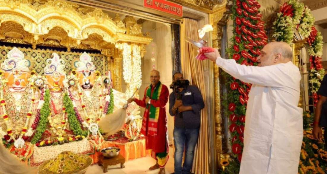 Union HM Amit Shah performed the ‘mangla aarti’ and Gujarat CM Bhupendra Patel performed ‘pahind vidhi’, the ritual of cleaning the way using a golden broom.